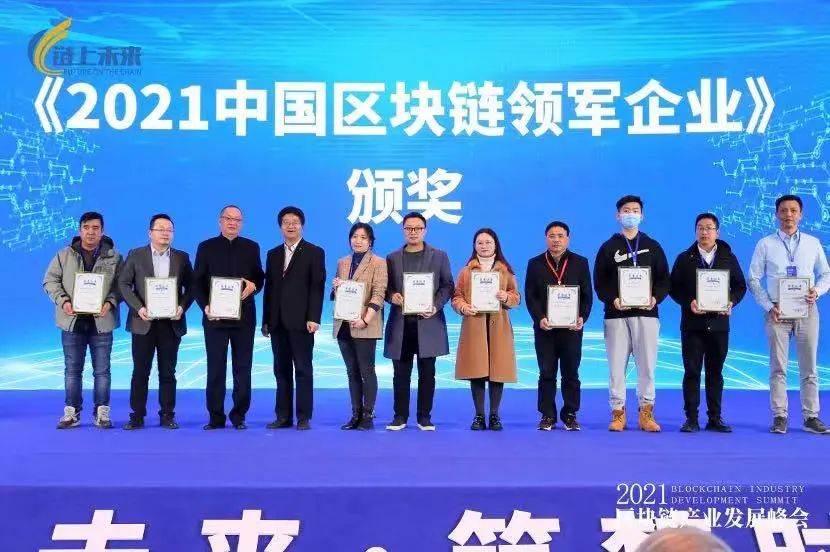 2021中国区块链领军企业(“名企”)证书由链上未来·2021区块链产业开展峰会组委会、赛迪(青岛)区块链研究院联合颁发。